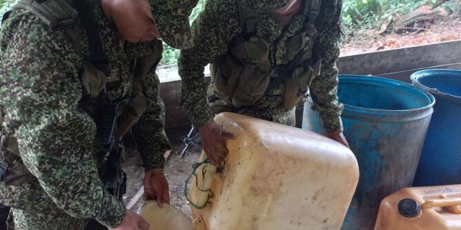 En su interior fueron encontrados 1.345 galones de base de coca en proceso, 1.020 kilogramos de hoja de coca picada, 151 galones de combustible, así como 659 galones de insumos líquidos y 219 kilogramos de insumos sólidos.