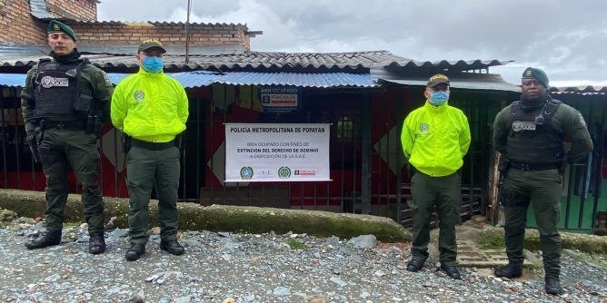 En la mañana de este jueves se conoció que un operativo conjunto adelantado por uniformados adscritos a la Seccional de Investigación Criminal (SIJIN) de la Policía Metropolitana de Popayán, Fiscalía General de la Nación y la Sociedad de Activos Especiales (SAE), ocuparon con fines de extinción del derecho de dominio, dos inmuebles, los cuales habrían sido utilizados para la comercialización de sustancias estupefacientes.