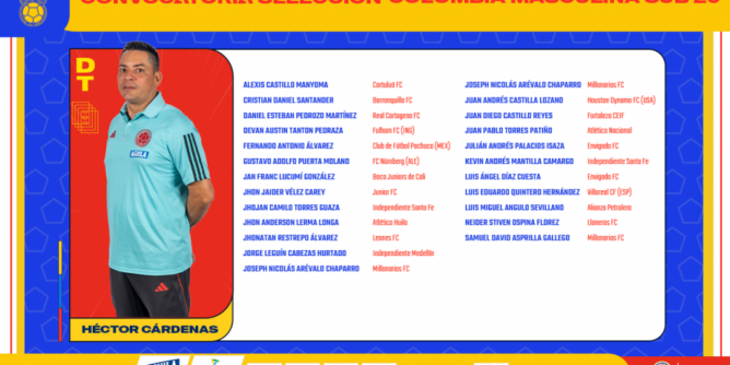 El director técnico de la Selección Colombia Masculina Sub-20, Héctor Cárdenas, dio a conocer los nombres de los 23 jugadores que estarán convocados para un nuevo ciclo de preparación, con miras a la Copa Mundial Sub 20 de la FIFA 2023.