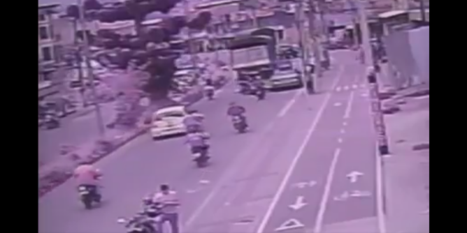 Una cámara de seguridad del sector, capto el momento cuando un motociclista que se desplazaba sobre la Calle 5, barrio San José de la capital caucana, impacto contra un automotor que estaba estacionado en la zona y al caer un tractocamión que venia por su mismo carril le paso una de sus llantas traseras por encima.
