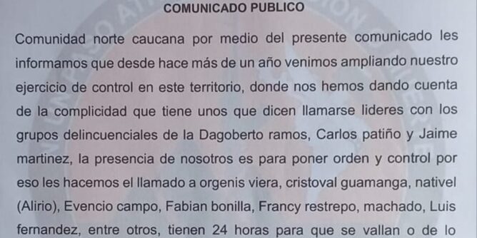 Preocupación en la comunidad del Municipio de Miranda por la aparición de un panfleto amenazante con nombres de personas declaradas objetivo militar.