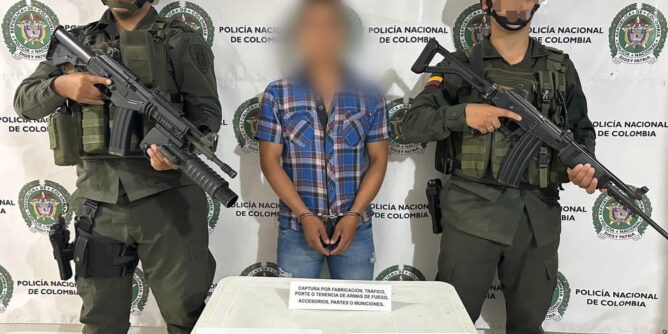 En el municipio de Bolívar, un sujeto de 27 años de edad, fue capturado por el delito de porte ilegal de armas de fuego, cuando la patrulla del cuadrante en medio de un registro, le fue hallada una pistola Prieto Beretta y 8 cartuchos calibre 7,65mm.