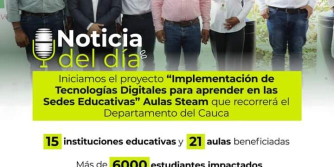 De acuerdo al mandatario seccional se hará una inversión en el Cauca por el orden de los siete mil millones de pesos ) que hacen parte de un programa junto a los departamentos de Valle del Cauca y Nariño.Indicó que son 6.000 estudiantes formados con este proyecto que va a permitir dar avances en los temas de tecnología e innovación buscando un verdadero compromiso para cerrar brechas digitales, fomentando en loss niños, niñas y adolescentes buenas prácticas en tecnología para fortalecer su proyecto de vida.