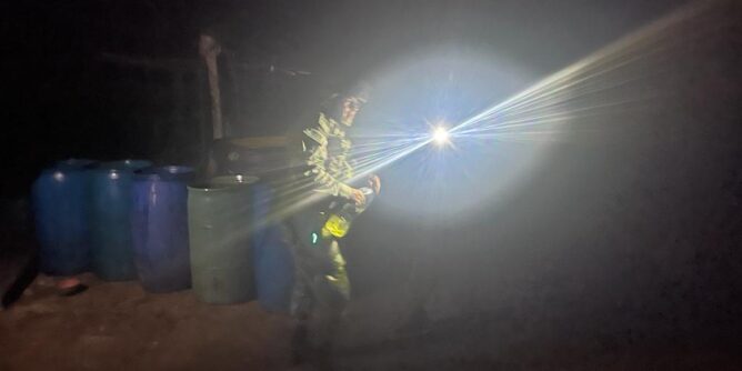 Durante la inspección del lugar, se incautaron insumos para la producción de esta sustancia alucinógena, además de diferentes equipos para su procesamiento, entre los que se encontraban 2.400 galones aproximadamente de pasta base de coca líquida, equivalente a 1.400 kilogramos de pasta base de coca, 05 canecas plásticas y dos metálicas de 55 galones, 02 tanques con capacidad de 4.000 litros y en su interior 46 kilos de hoja de coca macerada, al igual que una máquina picadora, entre otros elementos, que se le atribuyen presuntamente al grupo armado organizado estructura “Dagoberto Ramos”, que delinquen en ese sector.
