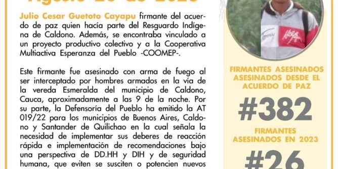 Según Indepaz este sería el firmante #26 asesinado en lo que va de este 2023 y el #382 desde que se firmó el acuerdo de paz.
