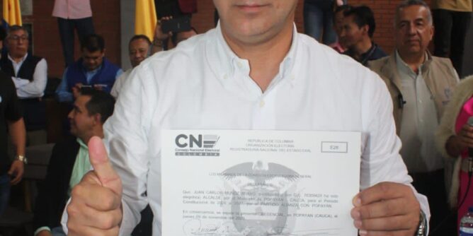El Consejo Nacional Electoral entregó la credencial al alcalde electo de Popayán, Juan Carlos Muñoz Bravo, para el periodo 2024-2027.En acto que se cumplió en la institución educativa Alejandro de Humboldt de la capital caucana, el delegado de la Registraduría del Estado Civil en el Cauca, Oscar Fredy Paz Ramírez entregó el documento al nuevo alcalde de los payaneses, quien se inscribió por firmas en un movimiento denominado Alianza con Popayán.Juan Carlos Muñoz, logró el triunfo para la alcaldía, al obtener 36.917 votos, frente a José Luis Diago Franco del Pacto Histórico, que obtuvo una votación de 36.155.Muñoz Bravo, quien inicia su mandato a partir del 1 de enero del 2024, aseguró que trabajará incansablemente para atender la problemática de la capital caucana y mejorar las condiciones de vida de los payaneses.