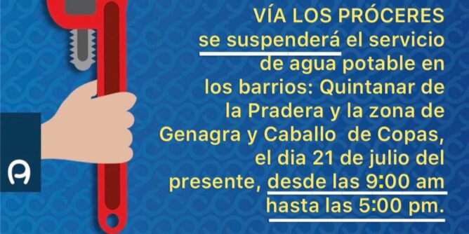El Acueducto y Alcantarillado de Popayán, informa a la ciudadanía que con el fin de realizar empalmes en las nuevas redes de acueducto, en el tramo 3, de la durura vía Los Próceres, se suspenderá el servicio de agua potable en los barrios: Quintanar de la Pradera y la Zona de Genagra y Caballo de Copas el dia 21 de julio, desde las 9 am, hasta las 5 pm.