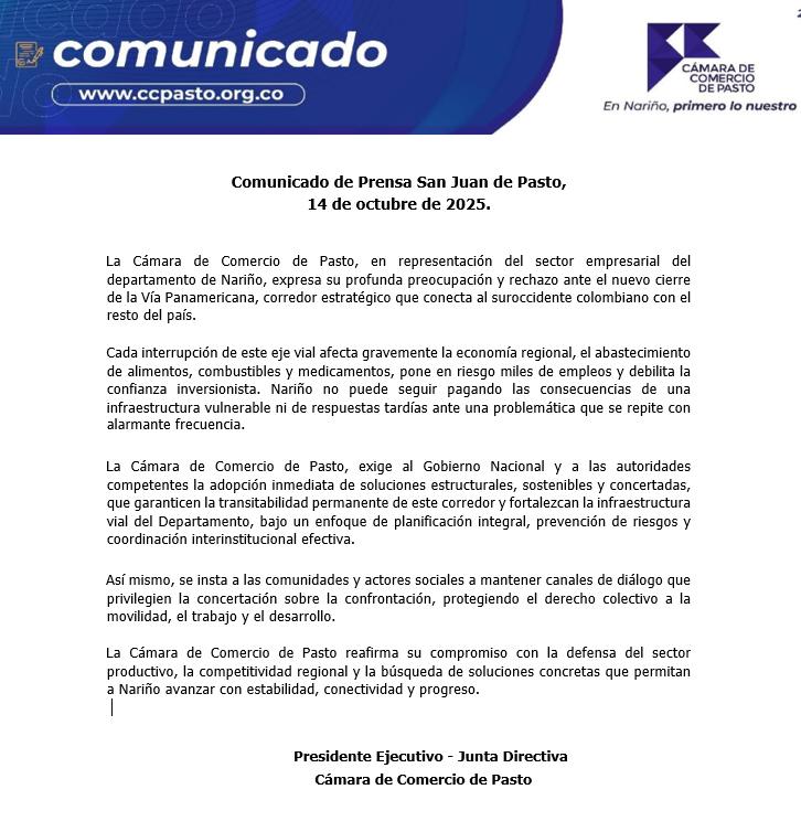 Por medio de un comunicado, la Cámara de Comercio de Pasto rechazó el nuevo taponamiento de la vía internacional y que este afecta la economía regional, pone en riesgo la inversión empresarial, así como miles de empleos.