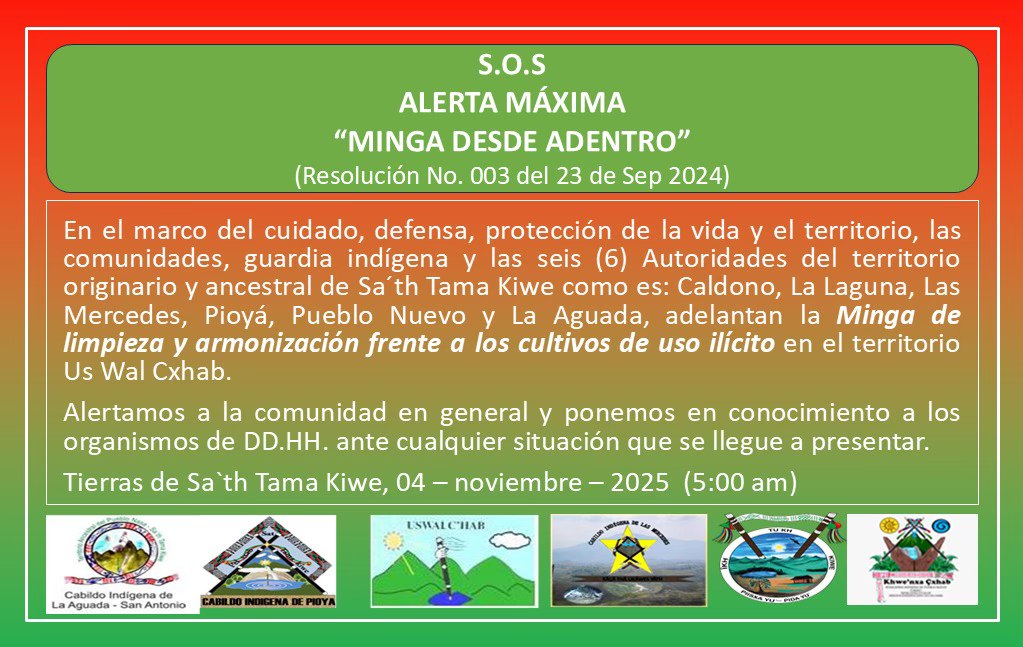 Durante esta acción se presentaron algunas agresiones verbales, intimidaciones y amenazas directas por parte de algunas familias que fueron identificadas y que son habitantes de las veredas de Santa Elena y Venteadero, evidenciando una gran molestia por la erradicación comunitaria. A pesar de las negativas y las agresiones, se indicó que estos procedimientos de control territorial se extenderán a otras zonas, previa realización de asambleas, para que sean ellas las que tomen decisiones, según lo señalaron las autoridades tradicionales.