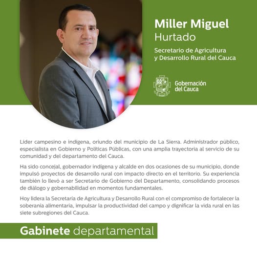 Después de haber mostrado muy buenos resultados como secretario de Gobierno del Cauca, Miller Hurtado asume ahora como jefe de cartera de la Secretaría de Agricultura y Desarrollo Rural.