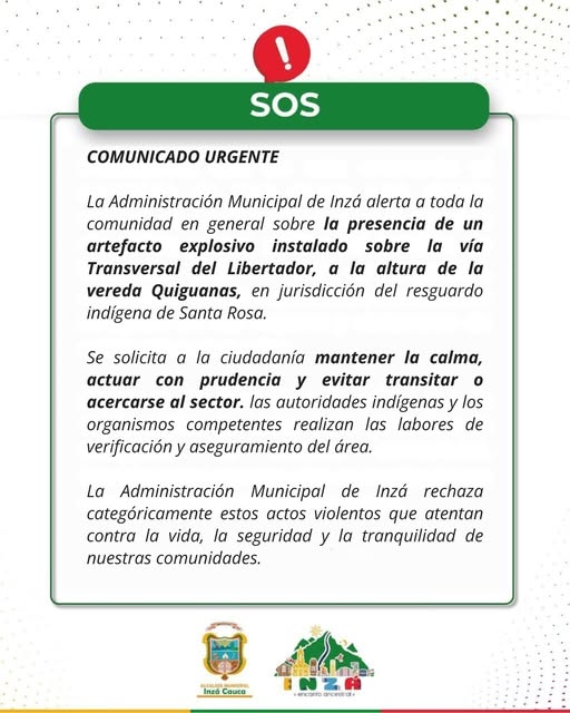 No paran los actos de violencia en el municipio de Inzá, al oriente del Cauca. En los últimos minutos, desde la administración municipal se lanzó una alerta a la comunidad, por la presencia de un posible artefacto explosivo en la vía Trasversal del Libertador a la altura de la vereda Quiguanas, en inmediaciones del resguardo indígena de Santa Rosa.