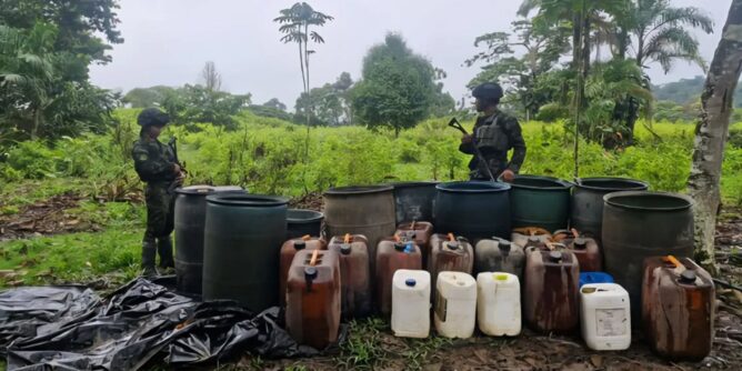En una operación desarrollada en zona rural del municipio de Barbacoas, las tropas del Batallón de Selva N.º 53 hallaron y destruyeron un depósito ilegal destinado al almacenamiento de insumos para el procesamiento de pasta base de coca.
