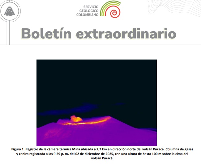 “Durante el periodo de tiempo evaluado en el presente boletín se mantiene el registro de tremor continuo y las columnas de gases y ceniza observadas han presentado alturas de hasta 100 m. En total, se registraron cinco emisiones de ceniza desde el cráter del volcán Puracé, para las cuales se emitieron boletines a la aeronáutica civil (VONA). Estas se dispersaron hacia el sureste y fueron reportadas por la red de vigías en campo desde los sectores de Cristales y Agua Hirviendo como caída leve de ceniza. Destaca la emisión de las 7:32 a. m. del día de ayer, que fue reportada desde la vereda Río Negro, en el sector de Paletará”.