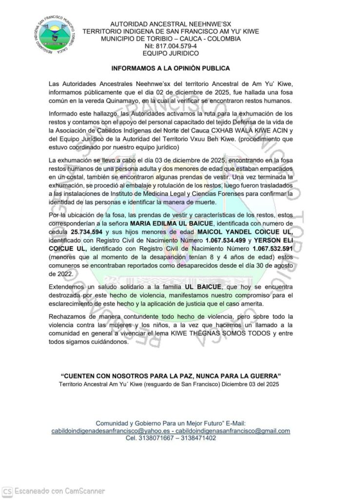 Hay preocupación entre las comunidades indígenas del Cauca, en especial del municipio de Toribío, tras el reciente comunicado de las autoridades del territorio indígena San Francisco AM YU’ KIWE; donde se informó del hallazgo de una fosa común, en cuyo interior se encontraron los restos de una mujer y dos niños.