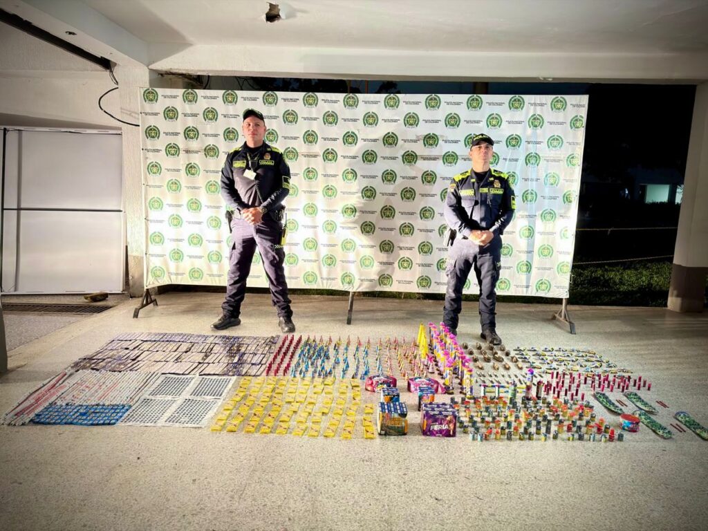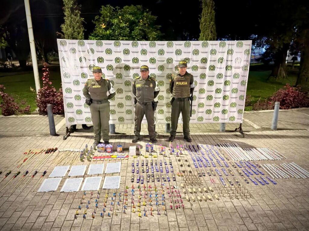 En el primer procedimiento, realizado en el sector de la estación de servicios Los Faroles, se hallaron cerca de 30 kilos de material pirotécnico presuntamente destinado a ser distribuido de manera irregular durante la temporada decembrina. En desarrollo de esta acción se aplicó una medida correctiva por comportamiento contrario a la convivencia, conforme al Código Nacional de Seguridad y Convivencia Ciudadana.