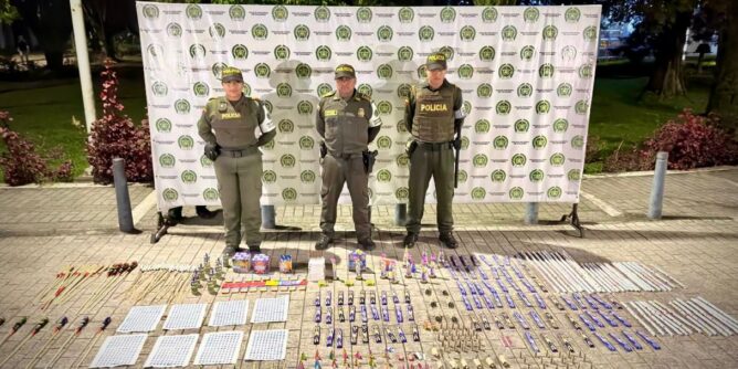 En el primer procedimiento, realizado en el sector de la estación de servicios Los Faroles, se hallaron cerca de 30 kilos de material pirotécnico presuntamente destinado a ser distribuido de manera irregular durante la temporada decembrina. En desarrollo de esta acción se aplicó una medida correctiva por comportamiento contrario a la convivencia, conforme al Código Nacional de Seguridad y Convivencia Ciudadana.