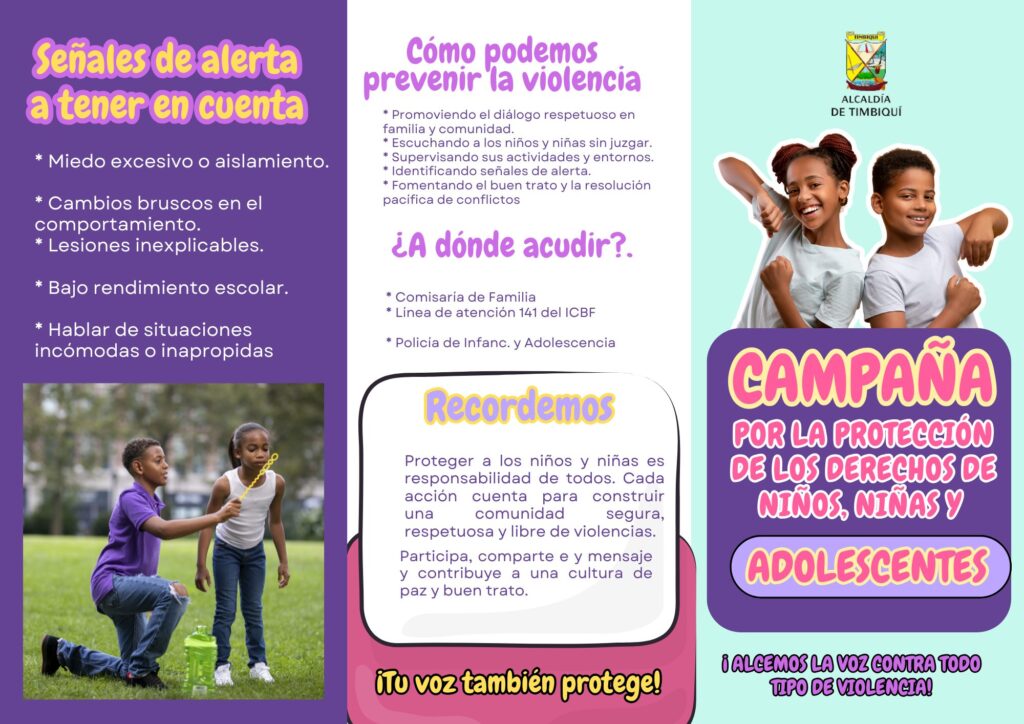 En el municipio de Timbiquí, costa pacífica caucana, la alcaldía municipal está liderando una campaña de protección para niños, niñas y adolescentes, con la cual se busca garantizar los derechos y la seguridad de los infantes y los jóvenes ante cualquier situación que vulnere su integridad física o psicológica.