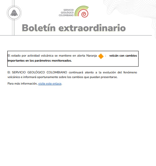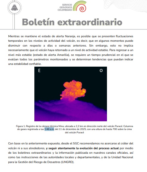 por ahora se mantienen los niveles de alerta y se recomendó a la comunidad a estar atenta a la información entregada por el Servicio Geológico Colombiano, ante cualquier eventualidad que se pueda presentar con el Volcán Puracé.