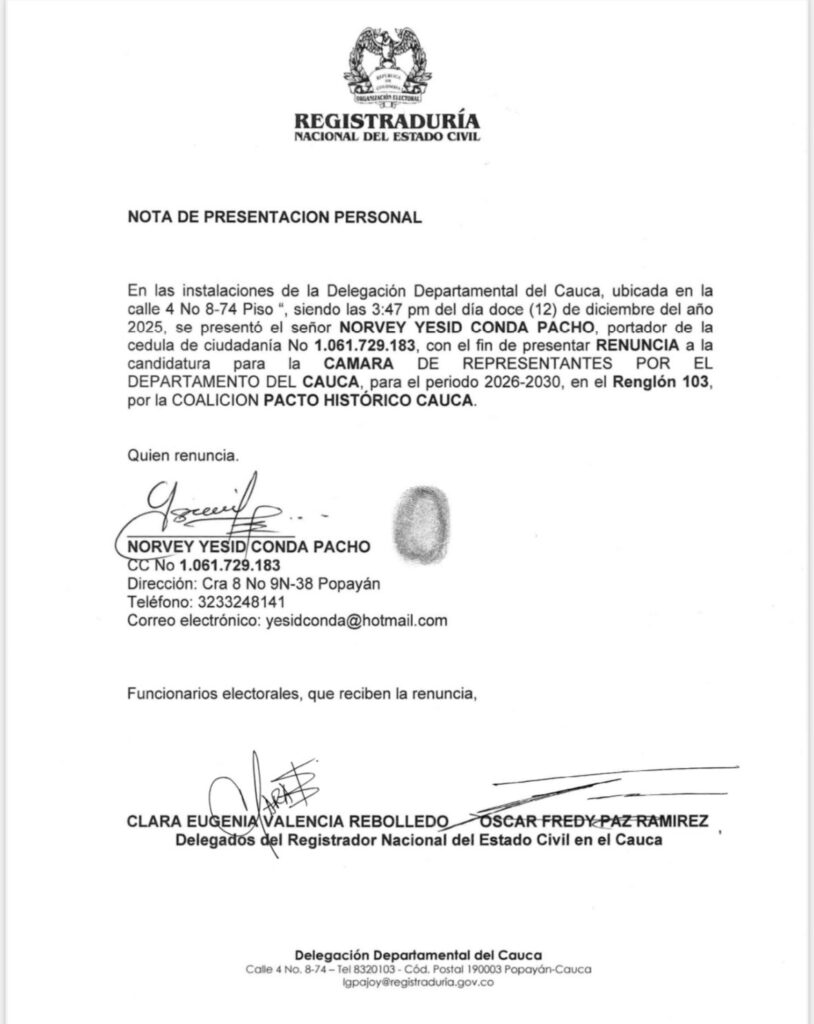 El destacado dirigente indígena, ex – consejero Mayor del CRIC y quien se sometió a consulta del Pacto Histórico, logrando más de 43 mil votos Yesid Conda fue notificado oficialmente este sábado por la Registraduría sobre la aceptación de la renuncia a su aspiración a la Cámara de Representantes.