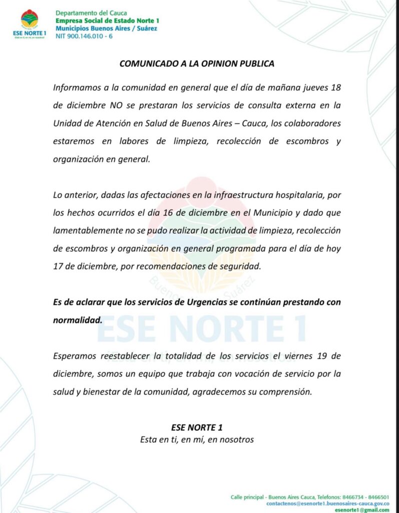 La consulta externa permanece suspendida en la Unidad de Atención en Salud del municipio de Buenos Aires, en el norte del Cauca, como consecuencia de los daños ocasionados por la violenta incursión del Frente Jaime Martínez, perteneciente a las disidencias de las Farc.
