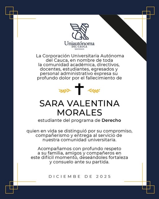Hay luto en la comunidad universitaria de la ciudad de Popayán. En medio de hechos que son materia de investigación, murió la joven estudiante del programa de Derecho de la Corporación Universitaria Autónoma del Cauca, Sara Valentina Morales, de 26 años de edad.