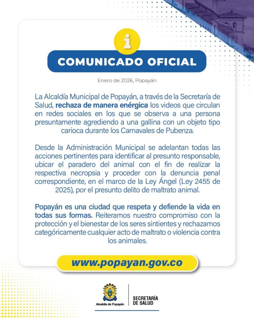 Por su parte, desde la Alcaldía de Popayán a través de la Secretaría de Salud municipal, se rechazó enérgicamente este tipo de comportamientos que atentan contra la integridad de los animales, considerando que los “juegos” y los carnavales no son justificantes para este tipo de actos atroces en contra de seres sintientes.