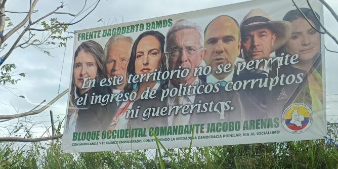 En varios puntos de esta población han aparecido mensajes de las estructuras armadas ilegales de las disidencias de las Farc, específicamente el bloque occidental Jacobo Arenas del frente Dagoberto Ramos, en donde se prohíbe el acceso a líderes políticos de extrema derecha.