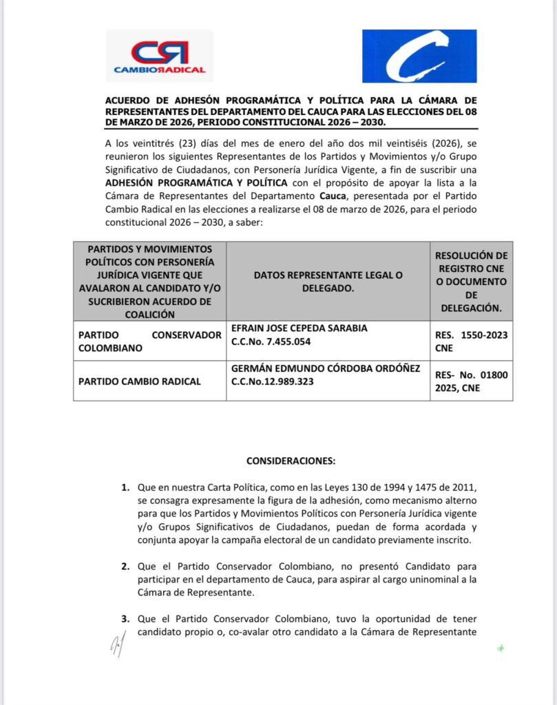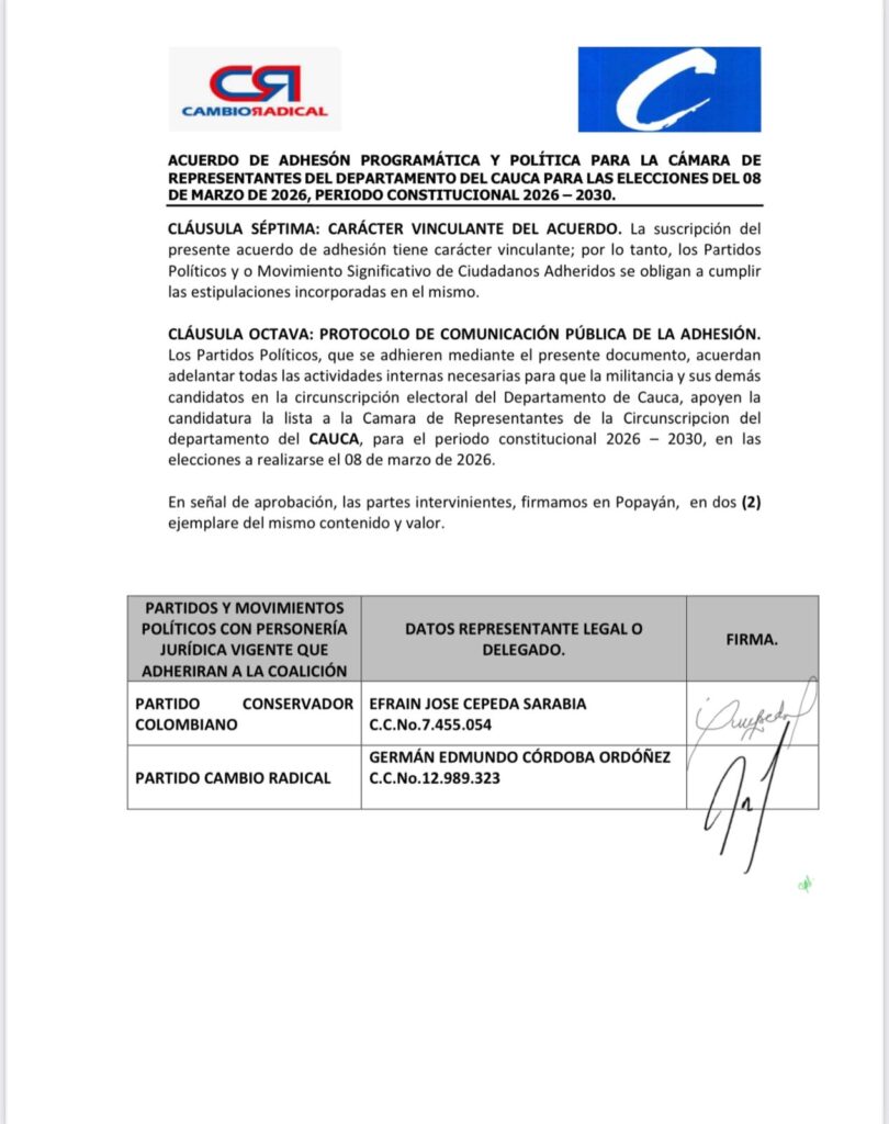 Según se pudo conocer, por medio de un acuerdo suscrito el pasado 23 de enero, el partido Conservador decidió respaldar de manera oficial a los candidatos del partido Cambio Radical en el entendido de no contar con candidatos propios en representación del Cauca, para el periodo constitucional 2026-2030.