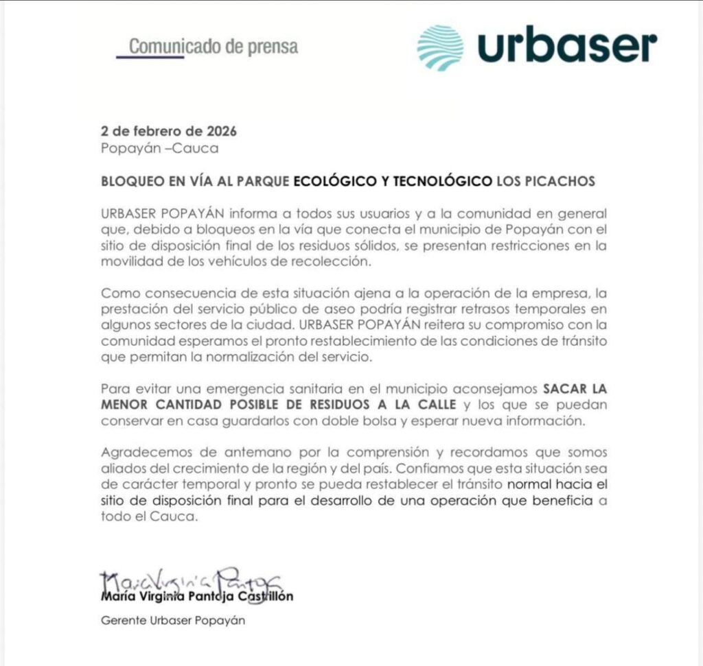 Según el comunicado, esta determinación se adopta como medida de última instancia, debido a los incumplimientos reiterados de los acuerdos pactados por parte de la Alcaldía de Popayán, la Gobernación del Cauca y la falta de compromiso de la empresa Urbaser con el bienestar de las comunidades ubicadas en el área de influencia del relleno.