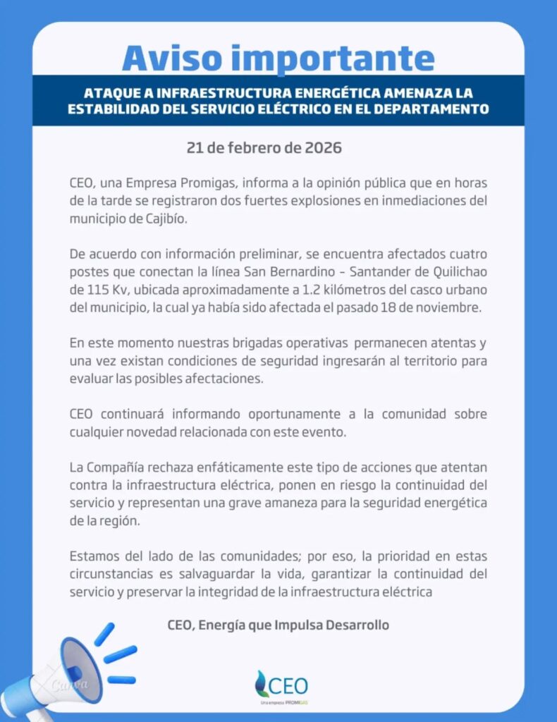 Comunicado oficial de la Compañía Energética de Occidente CEO, sobre daños a la red eléctrica en Cajibío.