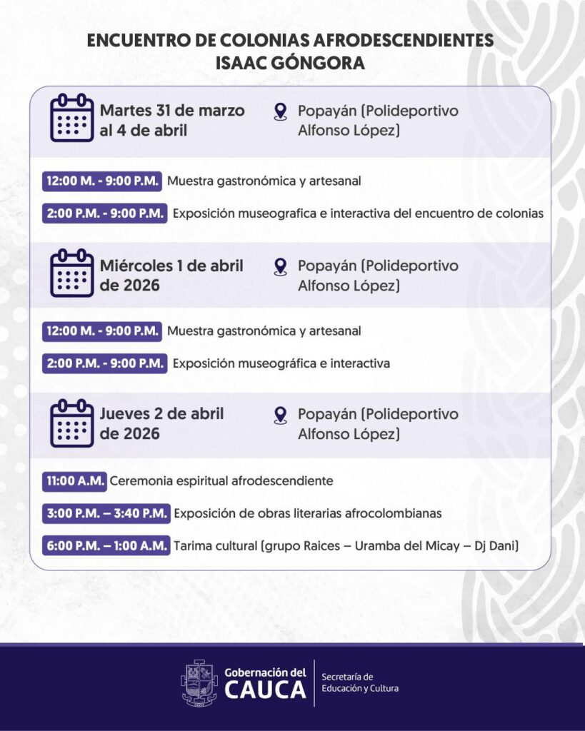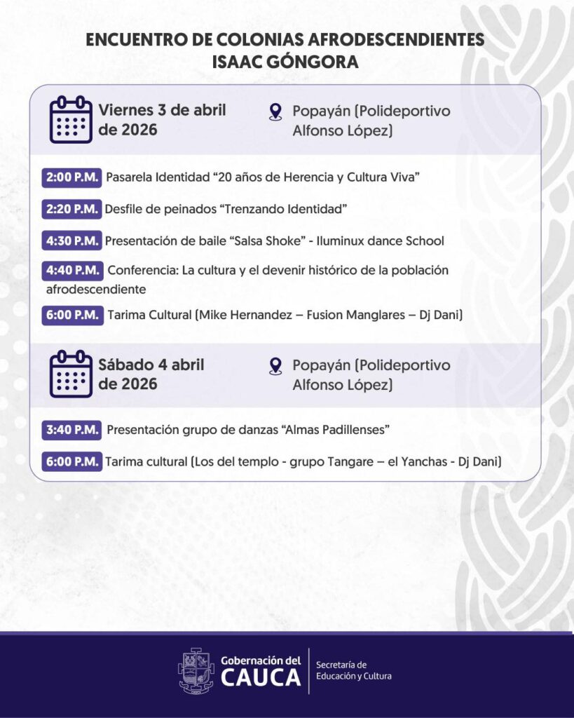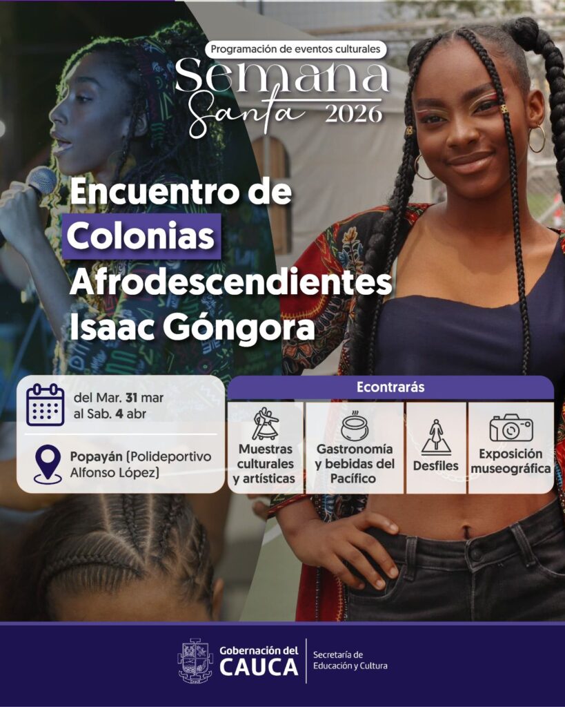 En el marco de la Semana Santa, el gobierno del Cauca, a través de la Secretaría de Educación y Cultura, promueve la realización del XX Encuentro de Colonias Afrodescendientes “Isaac Góngora”, un espacio dedicado al reconocimiento, aprendizaje y diálogo de saberes de estas comunidades.