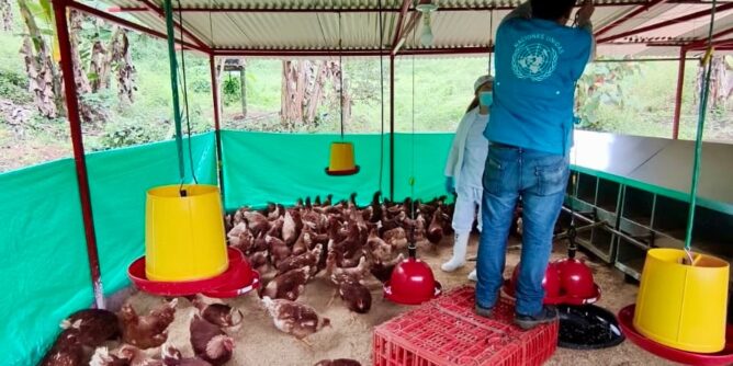 La jornada se realizó con el apoyo de la Organización de las Naciones Unidas para la Alimentación y la Agricultura y la Agencia para la Reincorporación y la Normalización. Según se informó, el proyecto contempla la entrega de cerca de 590 gallinas, además de asistencia técnica especializada e instalación de galpones, con el propósito de consolidar un proceso productivo sostenible en el territorio.