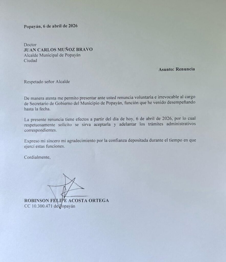 El secretario de Gobierno del municipio de Popayán, Robinson Felipe Acosta Ortega, presentó su renuncia voluntaria e irrevocable ante el alcalde Juan Carlos Muñoz Bravo, según se conoció en las últimas horas.