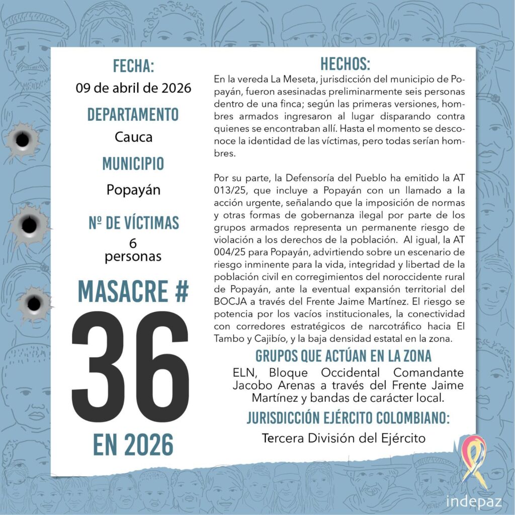 De acuerdo con el Instituto de Estudios para el Desarrollo y la Paz (Indepaz), esta es la masacre número 36 registrada en Colombia en lo corrido del año 2026, y la cuarta en el departamento del Cauca. En los primeros meses del año ya se habían presentado hechos similares en Santander de Quilichao, Padilla, Cajibío y ahora en Popayán.